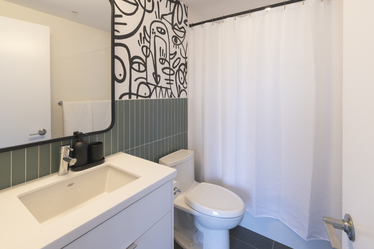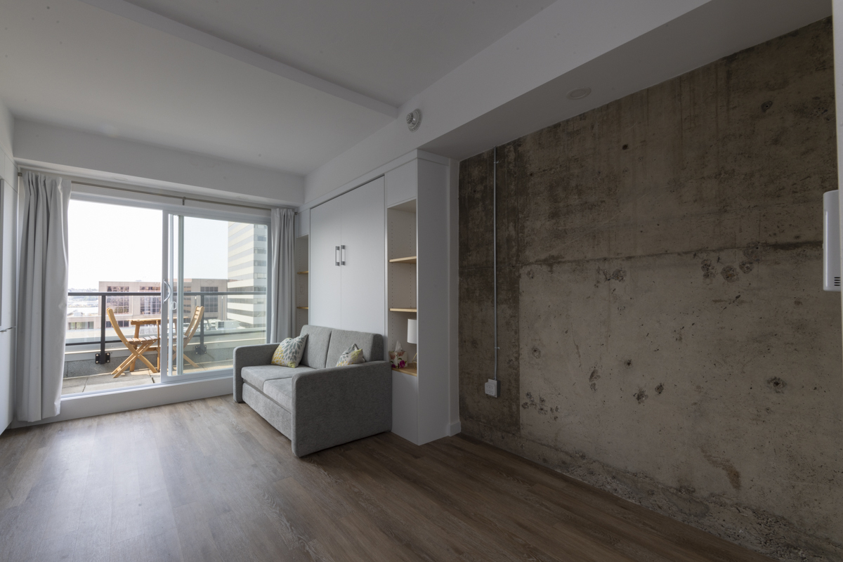 The Shuffle is a modern and vivid New York-inspired micro-suite building surrounded by some of the city’s best restaurants, bars, cafés, shops, and transit. Inside are 79 new apartments, anywhere from 250-square foot micro-studios to 2-bedroom units with exposed concrete walls and large windows facing the city or harbour. But there’s more to your new home than your private unit. The Shuffle takes public space seriously, with original artwork throughout, a stunning six-story mural, rooftop patio, and a vibrant ground floor retail level. In every way, this is a home designed and built to fit the way you like to live. Ready to find your place in the energy of the city?